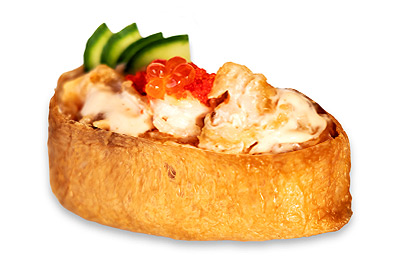 shrimps tempura, spicy sauce, ikura, cucumber, rice, inari