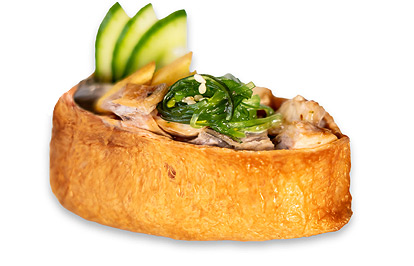 eel, chuka salad, spicy sauce, cucumber, sesame, rice, inari